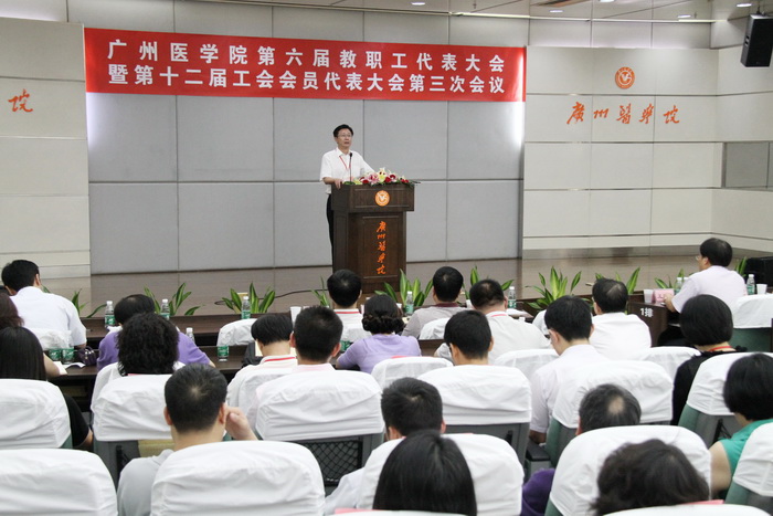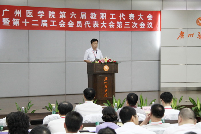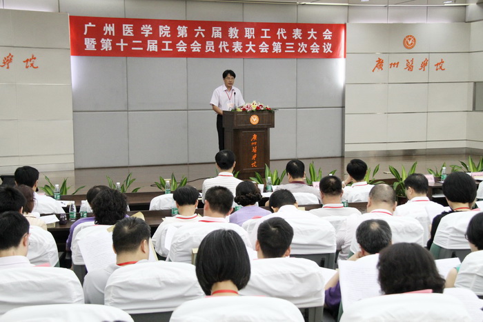 广医宣传网讯 5月30日下午,我校第六届教职工代表大会暨第十二届工会会员代表大会第三次会议在校本部10号楼13楼报告厅举行。学校党政领导到会出席,195名代表参加了会议。会议由校党委副书记、工会主席张强主持。