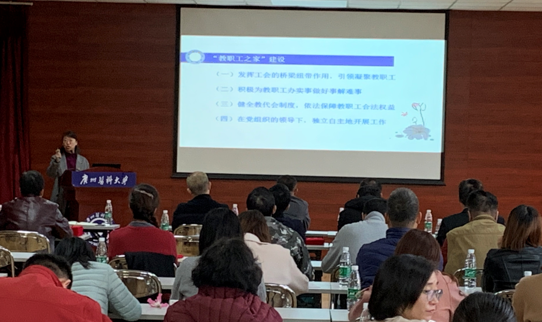 为总结学校工会2019年工作情况,促进学校的发展建设,激励广大工会干部鼓足干劲,推动工会工作上新台阶,学校工会于2019年12月27日上午,在番禺校区教工活动中心召开2019年校本部工作总结暨表彰大会。学校党委常委、副校长、工会主席方灿辉,校工会委员会委员、经审会、女职委中本部委员,校本部部门工会主席、委员和直属小组长等工会干部出席了会议。会议由学校工会副主席冯卫东主持。